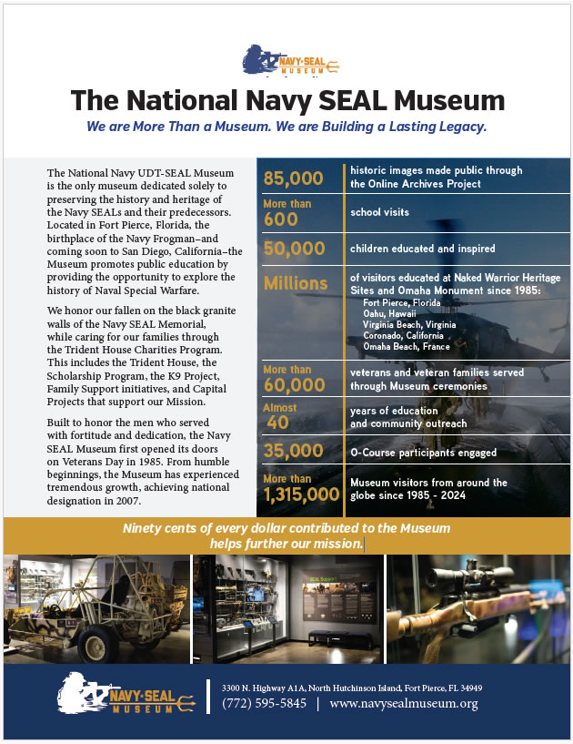 Since 2015, the Navy SEAL Museum has been serving nationwide through a charitable outreach to families in need. Our Navy SEAL Museum Charities Program offers comprehensive support to the Special Operations community through four key initiatives.