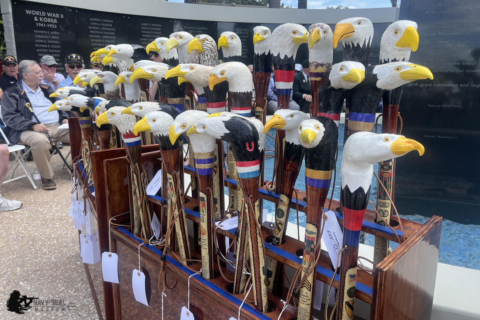 The Purple Heart Cane Ceremony is held annually at the Museum’s Memorial Wall where individually hand-carved and personalized canes are presented to combat-wounded recipients of the Purple Heart Medal or Gold Star families.